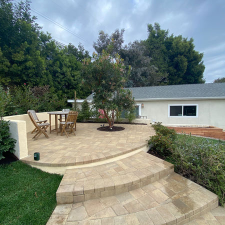 We installed new pavers for the large walkway that runs from the front to the back of the backyard. We built a large concrete wall with stucco all around for privacy. The new courtyard also has new pavers, grass sections, and a sprinkler system. We planted new trees and built a wood-raised vegetable bed. For decorative accents, we added new concrete steps, smart exterior lights, artificial turf installation, river rock installation, and new drain lines to prevent flooding. We also built a custom floating deck that sits in between trees.